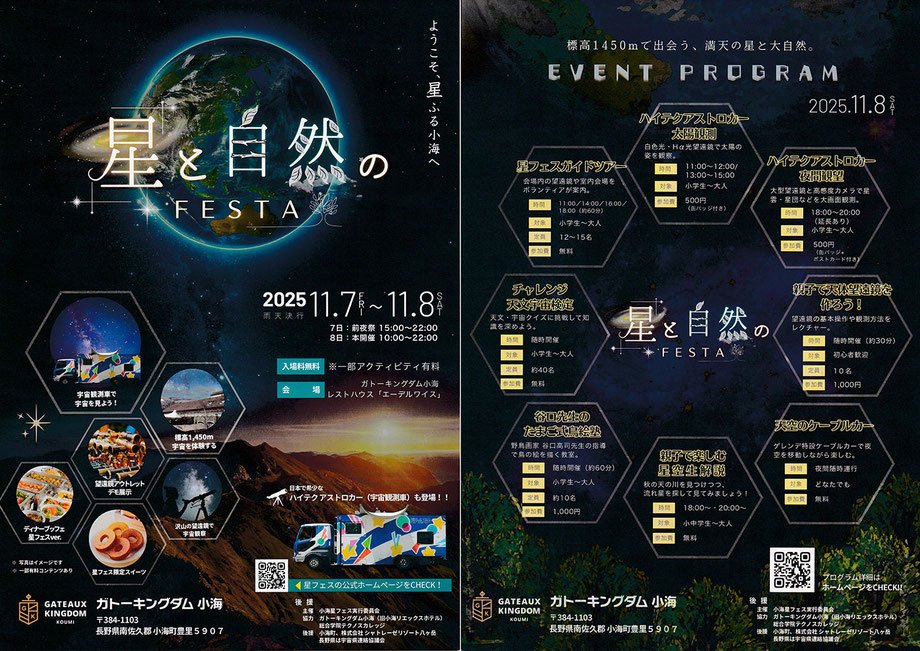 2025年11月7日(金)から11月8日(土)に長野県小海町のガトーキングダム小海・レストハウス「エーデルワイス」で開催される「八ヶ岳 星と自然のフェスタ」に出店します。