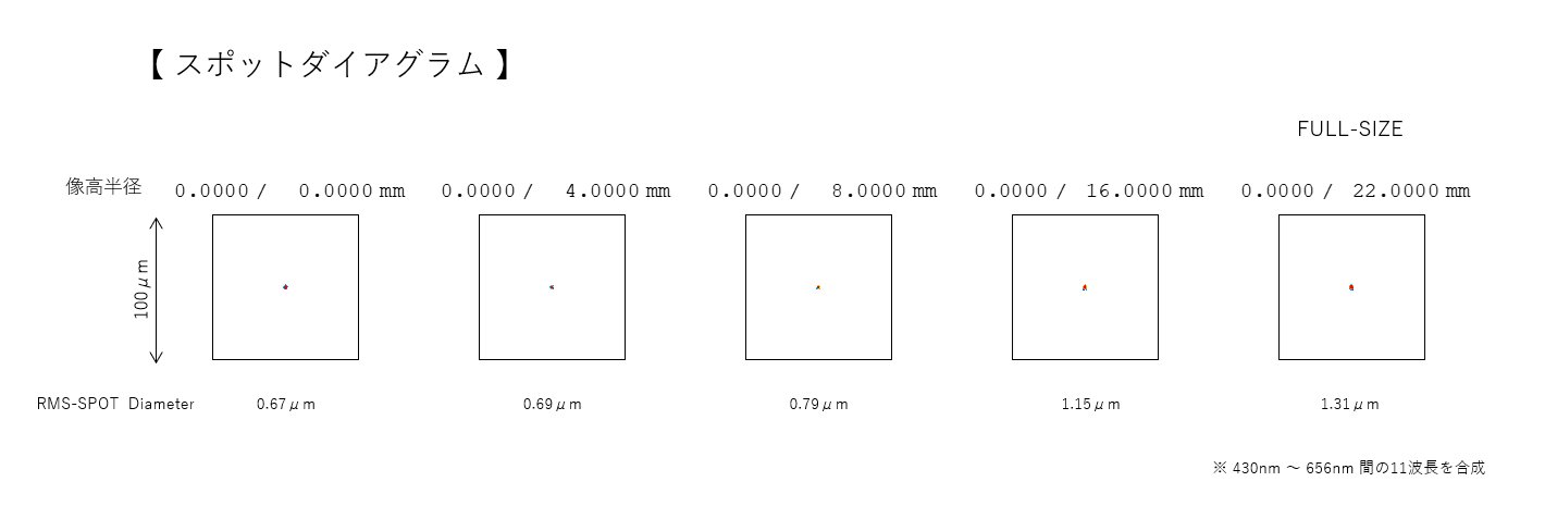 - スポットダイアグラム直径は、中心で約0.67μm※1、フルサイズ最周辺でも1.31μm※1という、回折限界のエアリーディスクよりも遥かに小さな値で設計されています。