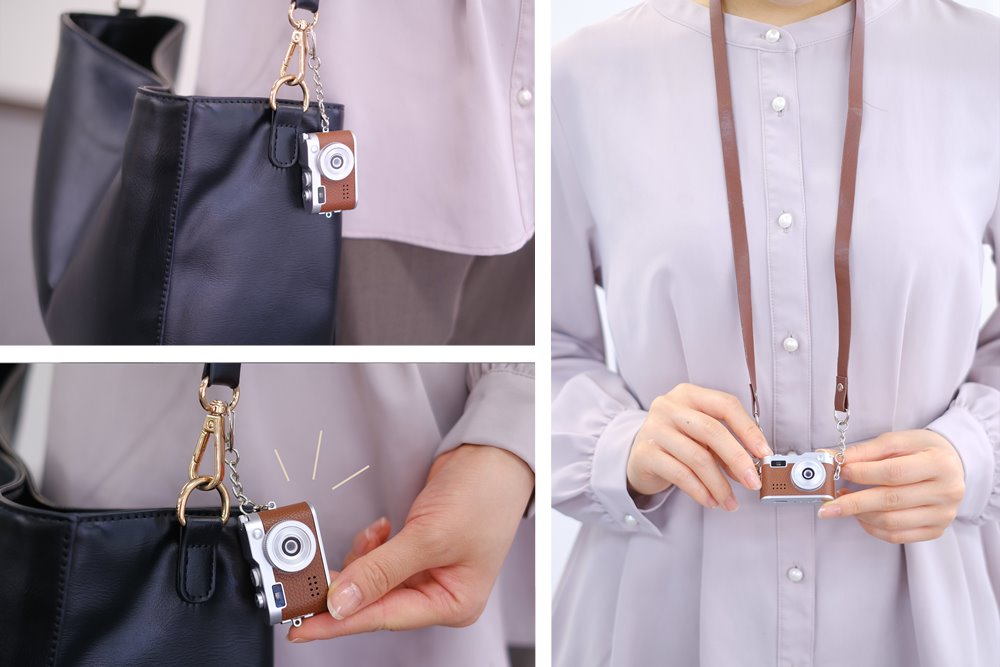 本体レザーと同色のネックストラップと、キーホルダーのようにハンドバッグなどに取り付け可能なキーチャームが付属しています。いつでもどこでも、かわいいアクセサリーのように身に付けてお楽しみいただけます。 - 充実の付属品